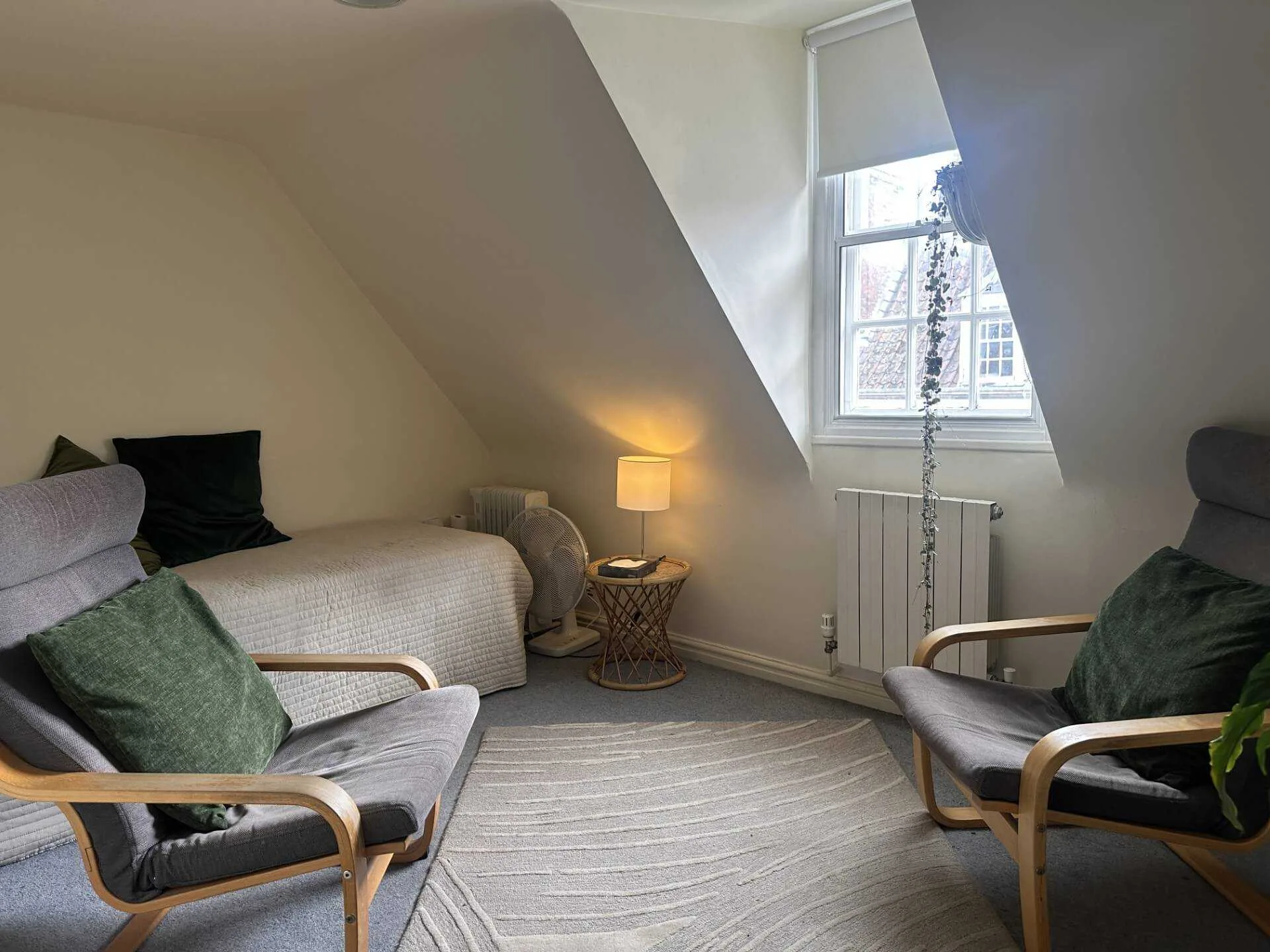 Situated on the second floor, at rear of the building, Room 8 is a large room with 2 chairs and a couch, suitable for individual or couples.